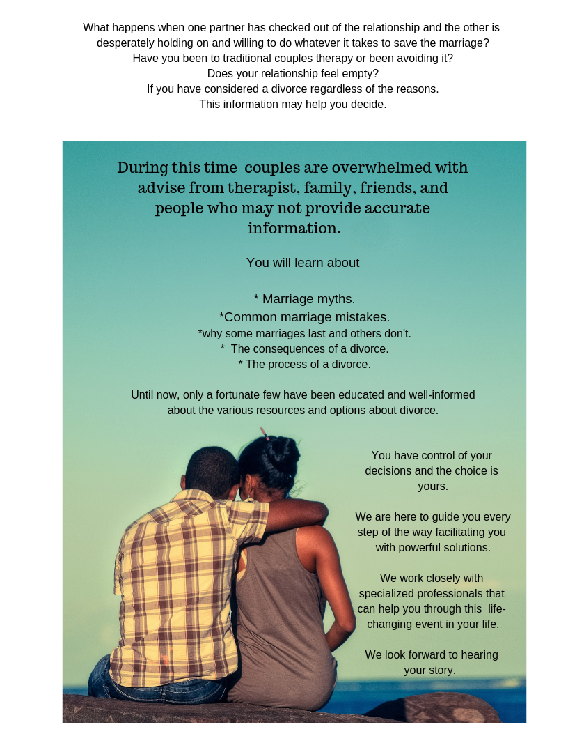 I am a divorce mediator. I offer mediation and info on the consequences and process of divorce. I'm a relationship consultant tailored to specific relationship concerns, provide information prior to marriage with marital perspectives and insight on how to avoid pitfalls. I work with a team of professionals who provide valuable information to a healthy marriage and lower the impact on divorce.
